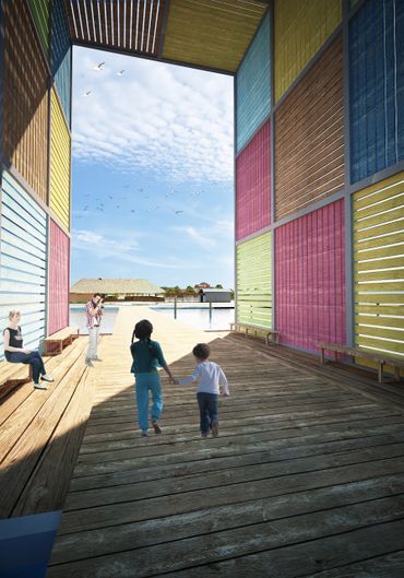 El nuevo muelle peatonal se convierta en el espacio de observación y contemplación, en el cual se abre una puerta hacia el infinito enmarcando una porción del horizonte en el cual el visitante se siente inmerso en las sensaciones del mar. Un horizonte que a lo largo de toda la costa va siendo remarcada con elementos puntuales y coloridos, el cual responde, como el parador mismo, a la imagen urbana colorida del puerto de San Felipe.