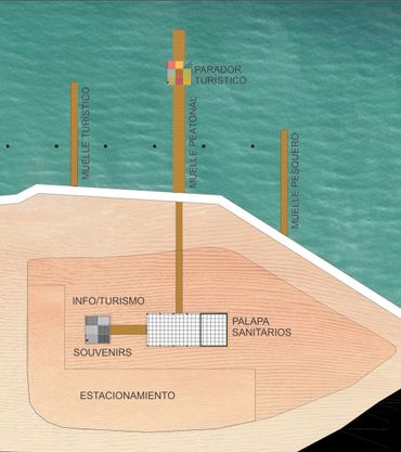 Se integra el edificio de la palapa existente, y se revitaliza con los nuevo espacios que albergan nuevos servicios, tales como el módulo de información y la tienda de souvenirs, y se reubican los servicios existentes de contratación de viajes turísticos concentrándolos en un módulo, dejando la palapa existente para los servicios de sanitarios que actualmente cuenta y de espacio multifuncional y versátil.